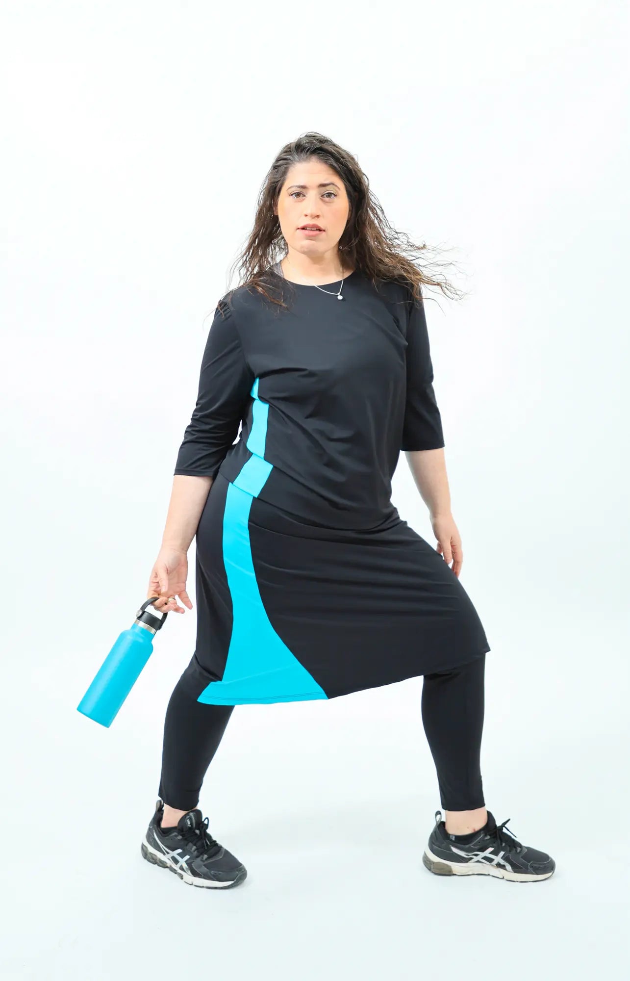 שחור וטורקיז חצאית ספורט. חצאית מתחת לברך עם טייץ באורך מלא וכיס!
