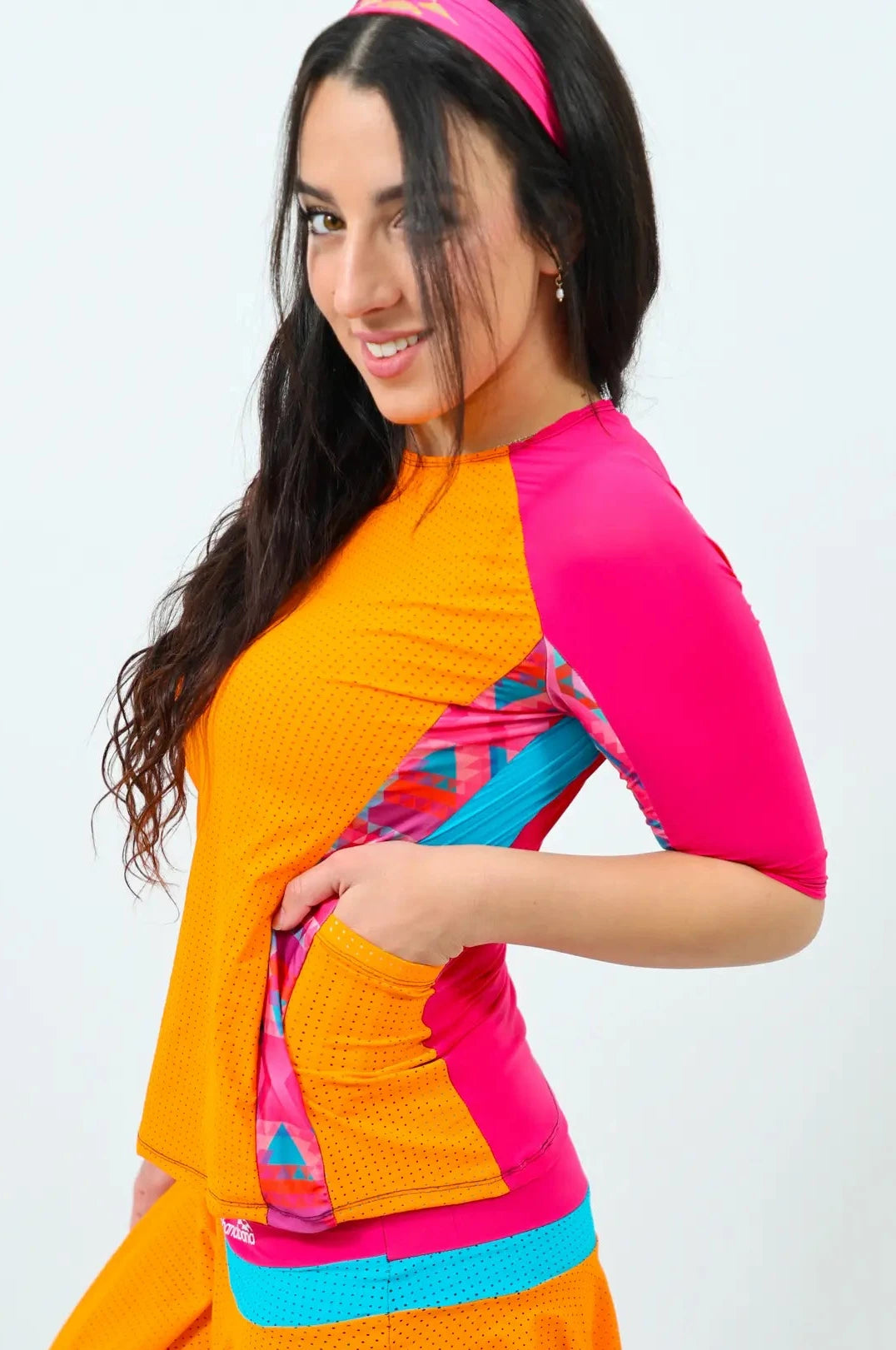 Orange mesh, Teal Mesh and pink Tennis skirt and 3/4 built in leggings and a pocket with matching exercise Triathlon shirt with 3/4 sleeves and two pockets in back.