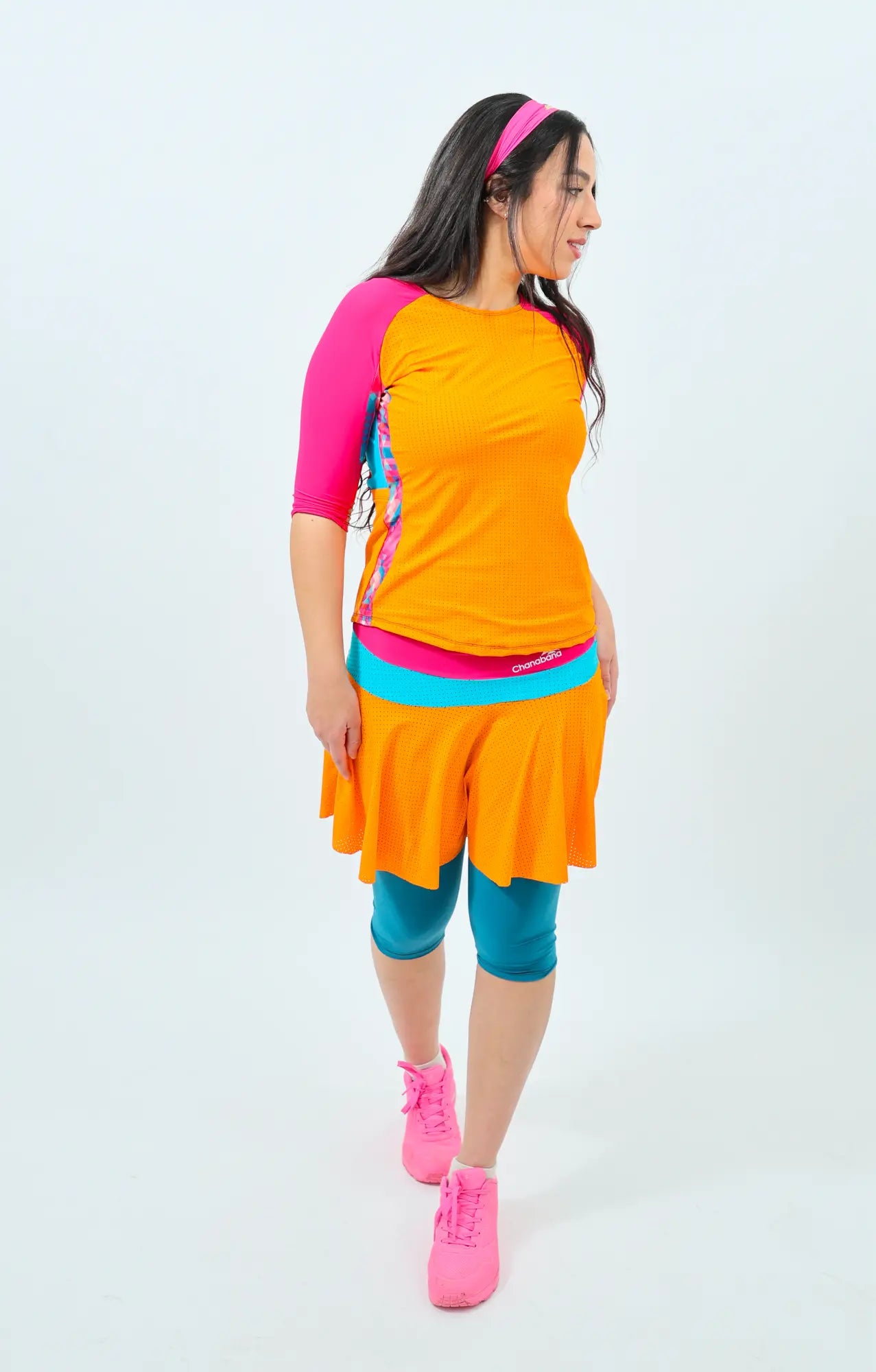 Orange mesh, Teal Mesh and pinkTennis skirt and 3/4 built in Teal leggings and a pocket. Skirt length: Short side- 48cm, Long side -57 cm Noam is 5'8 and wears size S Material: Polyester Lycra.